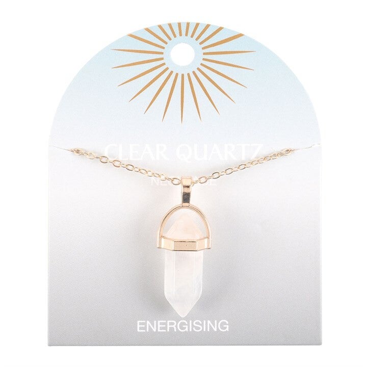 Carry the positive energy of crystal healing wherever you go by wearing this attractive gold toned stainless steel, crystal point necklace. Nickel Free.